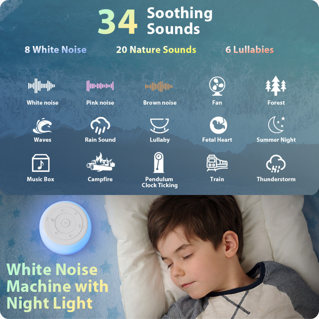 The Sleep Sound Machine includes 34 soothing sound options designed to help you relax and fall asleep faster. These sounds range from calming nature sounds like ocean waves, rain, and forest ambiance, to white noise, pink noise, and even lullabies. Whether you prefer the gentle hum of a fan or the rhythmic sounds of a heartbeat, there’s a sound to suit every sleep style.