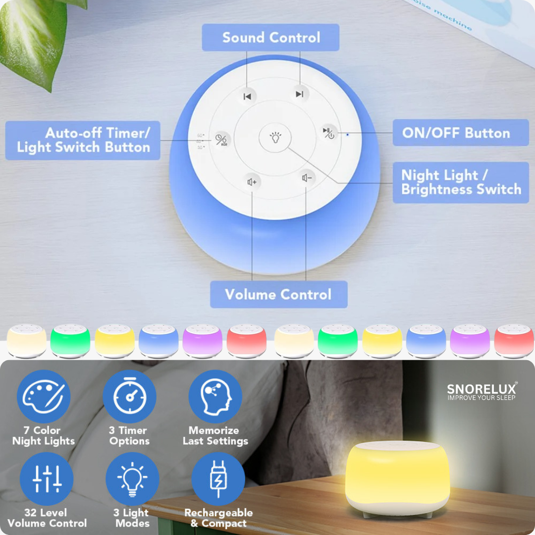 Drift into a peaceful slumber with the SleepSound Pro by Snorelux, the ultimate sleep sound machine for anyone seeking a portable, restful sleep sanctuary. This compact, travel-friendly device is perfect for home, office, or on-the-go, offering 34 expertly crafted sounds, including white noise, rain sounds, ocean waves, and calming lullabies. Block out distractions and create the perfect sleep environment for deep, uninterrupted rest.