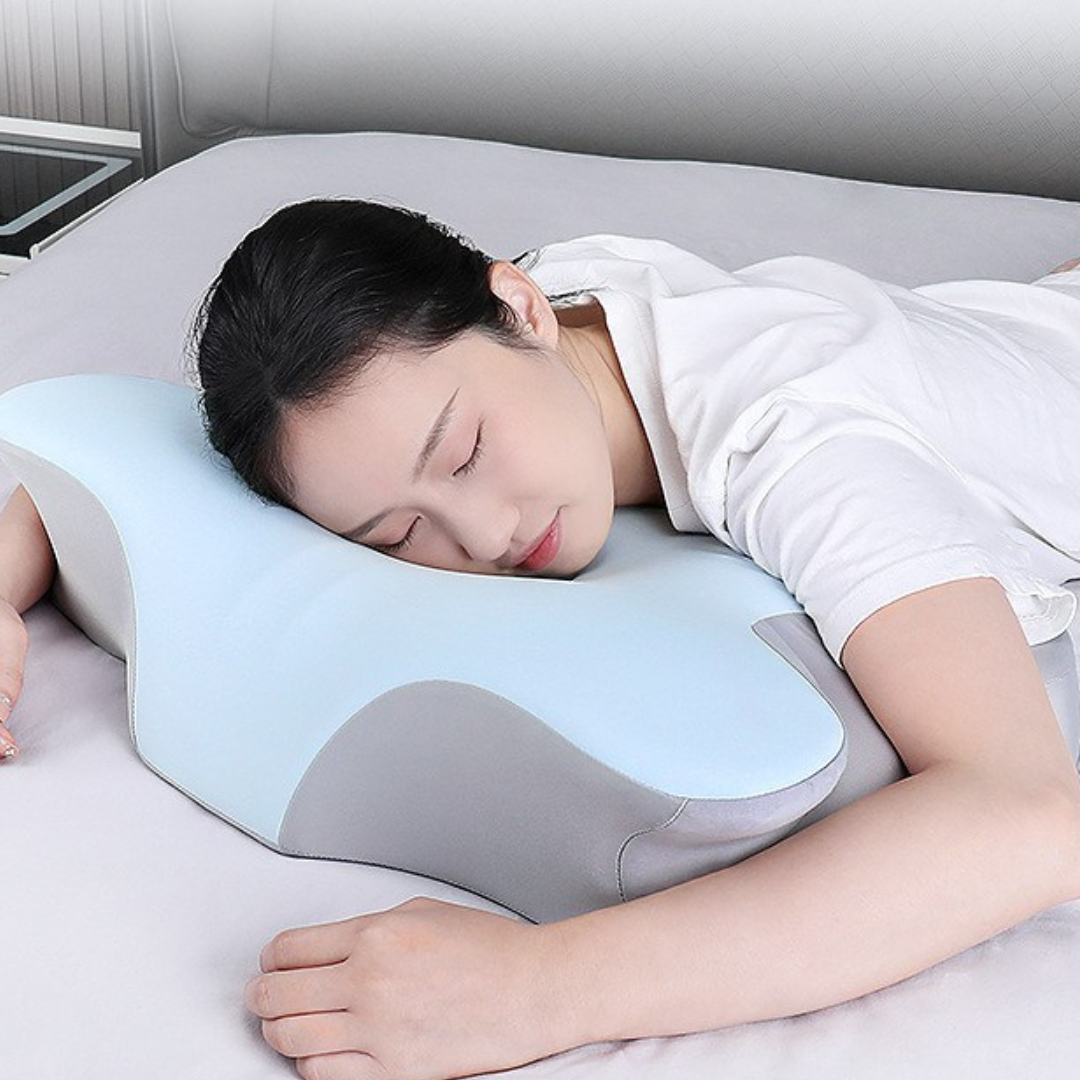 Snoring in children is often caused by poor sleep posture or airway compression. Our ergonomic butterfly design gently lifts and aligns the head and neck to promote natural, open-airway breathing — reducing mouth breathing and minimizing snoring without any invasive devices.