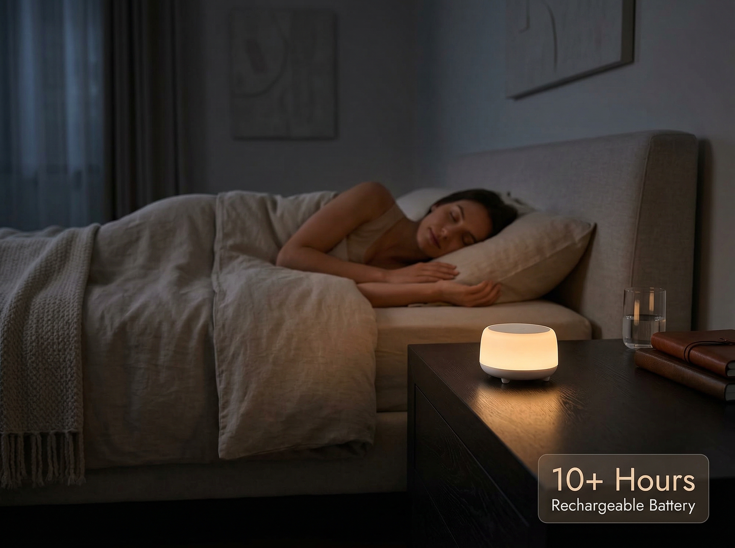 A built-in sleep timer (30, 60, or 90 minutes) allows the device to turn off automatically once you’ve fallen asleep, while the rechargeable battery provides up to 10 hours of use, making it ideal for bedside use, travel, or hotel stays. Charging is simple with the included USB-C connection.