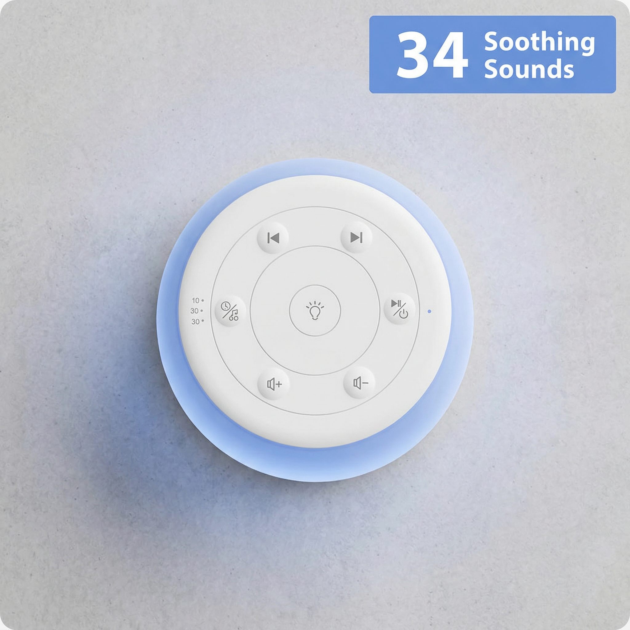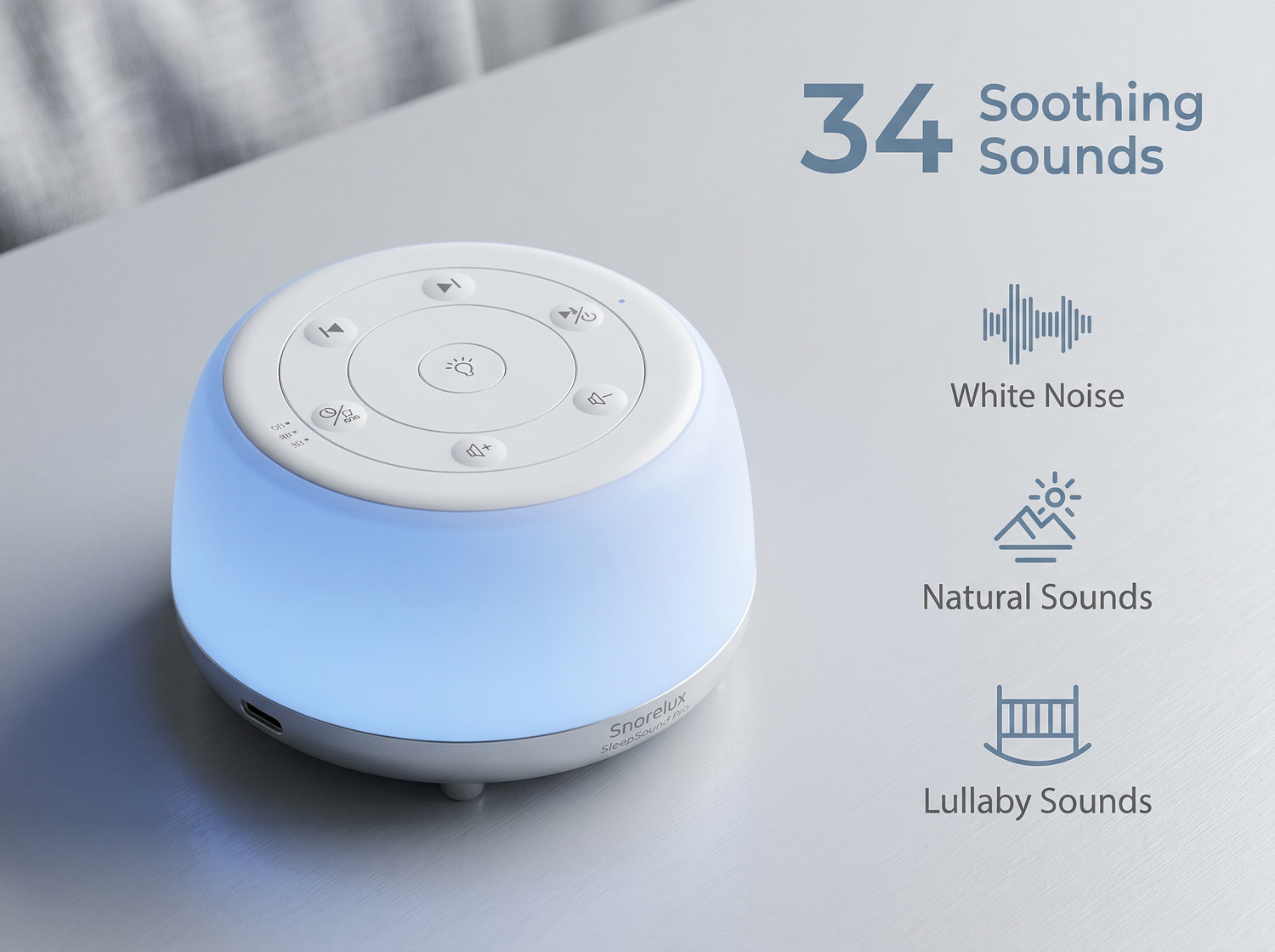 The Sleep Sound Machine features 34 expertly crafted sound options, including nature sounds, white noise, and lullabies, allowing you to select the perfect sound to suit your sleep preferences.